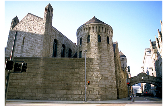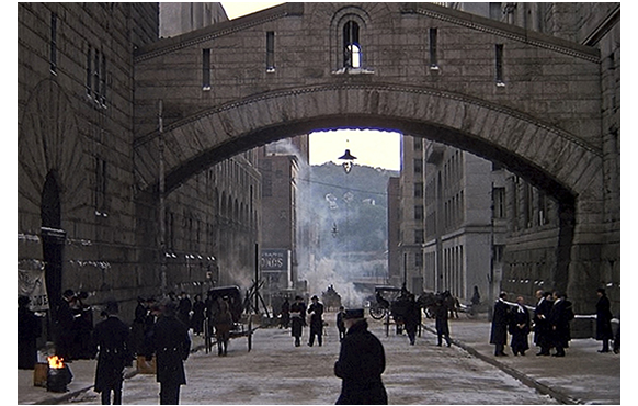 新聞売りの少年が、「ビドル兄弟、今日収監だよ」と叫んでいる。死刑制度反対の女性活動家が警官に丁寧に排除されている。「ビドル兄弟を自由に」との声も聞こえる。そして裁判所と刑務所を結ぶ「橋」が映される(1枚目の写真)。ついでながら、この建物は、今では歴史的建造物として観光の対象となっていて、参考までに私が昔撮影した写真も添える(2枚目)。映画の映像が如何に素晴らしいかがよく分かる。この橋の上で遊んでいる所長の息子のエディ(兄)とクラレンス(弟)。2人のやっているのは囚人ごっこで、当然、兄が看守、弟が囚人役だ。弟:「もう撃ちません」。兄:「クラレンス・ソフル、お前は重罪犯だ」。「お願い殺さないで」。「殺人犯の監房に一生閉じ込めてやる」。「二度と撃ちませんから」。弟を乗せた車輪付きのイスが、橋の中央にさしかかる(3枚目の写真)。兄の手を離れたイスは、クラレンスを乗せたまま坂を滑って裁判所側へ(4枚目の写真)。悲鳴を上げるクラレンス(5枚目の写真)。クラレンスは、裁判所と橋を仕切る鉄格子にぶつかって止まった。見上げると(6枚目の写真)、そこには、これから収監されるビドル兄弟がいる(7枚目の写真)。同行してきた守衛長に「クラレンス! あっちへ!」と叱られ、逃げ出す。この時の顔が可笑しい(7枚目の写真)。
