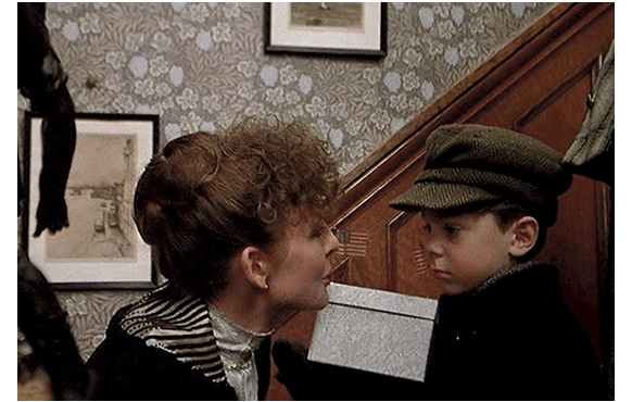 クリスマス・イヴの日。古代ローマの戦士姿の兄弟が「降りておいで!」と声をかけられ、プレゼントの待つ1階へ。そこには、ツリーの周りをおもちゃの鉄道模型が走っている。それを見たクラレンスが早速、「汽車で遊んでいい?」と訊く。「いいとも。だが慎重にな。いいか、まずスピードを落とすんだ。スイッチを反対に」「いいか、カーブではスピードを落とせ。そう、そうでいい」。やったと言わんばかりのクラレンス(1枚目の写真)。スイッチに最初に触ったのは積極派のクラレンス。兄のエディはそれを見ていて、「僕もやりたい」。「2人で代り番こにやるんだ」。その後、母と2人の姉妹がピアノに合わせて歌う(2枚目の写真)。幸せな日々ももうすぐ終わりだ。