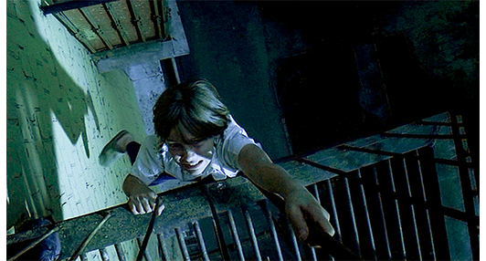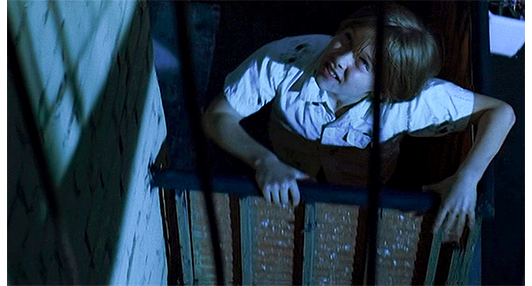 一旦イゴールを手に入れると、女吸血鬼はすぐに本性を現す。そして、屋上まで来た「虎」に対し、イゴールの血を吸うと脅し、自分の恋人を破壊した男〔それがアントンだとは知らない〕を呼ぶように命じる(1枚目の写真、イゴールの顔になぜ傷がついたのか?)。アントンは「渦」を鎮めると、直ちに息子の救出に駆けつける。「来たぞ、その子を放せ」。女吸血鬼は、自分の恋人が殺されたことだけでなく、アントンが闇の番人のくせに、自分が吸血鬼にさせられたことを防げなかったことを責める〔恋人=男の吸血鬼に血を吸われたことが原因〕。そして、「なぜ、この子の血を吸わせない?」と反論する。アントンは、「俺が許さないからだ」と、腰ベルトに付けていたドライバーを手に取る(2枚目の写真)。そして、「イゴール、逃げろ!」と叫んで襲いかかる。イゴールは女吸血鬼がひるんだ隙に逃げ出すが、吸血鬼はすぐに後を追う。その事態に介在したのは、闇の指導者ザウロンだった。アパートの屋上全体を異界にし、エレベーターを屋上まで突進させる(3枚目の写真、矢印はエレベーターの天井の上に乗ったイゴールと女吸血鬼)。この先の場面では、レベルの低い吸血鬼と「熊と虎」は登場しなくなる。