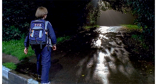 イゴールは、電話が終わって席を立った母に、「吸血鬼ってホントにいるの?」と尋ねる。母は、テキトーに答える。「いるわよ。親の命を吸い取る小さな男の子のことよ」。「マジメな話だよ。ホントにいるんだ。見たんだよ」。母は、イゴールの話など無視して他にも電話をかけるが、相手は不在。そこで、薬のビンを渡し、「ほら、これがお薬よ。今すぐ飲みなさい」と命じる。家を出ようとする母に、イゴールは再度、「ホントにいるよ。見たんだ」と声をかける。「ホントって、誰が?」。「吸血鬼だよ」。「いい加減なこと言わないの。もう大きいんだから、1人でも大丈夫よ」。母は部屋を出て行ってしまう。イゴールは仕方なくTVの前に座って薬を飲む。母がアパートから出て迎えに来たバンに乗って出かけると、バンの陰にいた女吸血鬼が映る。女吸血鬼は、イゴールの「何らかの痕跡」を辿ってアパートまで辿り着いたのだ。イゴールは木の枝をナイフで削って吸血鬼用の武器を作っている。その時、玄関で音がしたので振り返る(1枚目の写真)。そして、恐る恐る玄関の方に近づいていく(2枚目の写真)。そして、玄関ドアの覗き穴から見ると(3枚目の写真、矢印)、いきなり女吸血鬼が脅すように顔を出し、イゴールは顔をのけぞらせ、恐怖の叫び声を上げる。