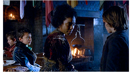 「寝るとこ、あるんか?」。「ううん」。ドジャーは近くの家への通路に入って行く。「おいら、親切な殿方 知ってる。まあ一種の、ほら、言うだろ… 慈善家さ。タダで泊めてくれる」。ドアが開き、オリバーは中に招じ入れられる(1枚目の写真)。そこにいたのは10名ほどの少年たち。全員がオリバーより少し年上だ。ドジャーは、「おいらのダチだ、フェイギン」と、暖炉でソーセージを焼いている年輩の男性に声をかける。フェイギンは、フライパンを持ったまま振り向くと、「やあ、坊や」と笑顔を見せる。そして、食事は始まる。オリバーにもソーセージが丸ごと1本配られる(2枚目の写真、矢印)。オリバーは、ドジャーがソーセージを皿に置いてもポカンとしている。「何か、知らねぇんだ」。フェイギンは、「ソーセージじゃ、オリバー。お食べ」と声をかける。「丸ごと?」。ドジャー:「うぶなのさ。産着が似合うぐらい〔Green. Green as a cabbage〕」。「皆、食べてええんじゃよ」。「おじさんは? 食べないの?」。ドジャー:「食べねぇんだ。ユダヤだから」。オリバーは手づかみでソーセージにかぶりつく。「どうだ、旨いか? めいっぱい食べろ、ノリー〔Nolly〕」。「ノリー?」。「オリバーじゃ、長いだろ? あだ名 できたから、仲間だ」〔ノリーという表現は、他の映画では一切出て来ないが、原作には出てくる。それは、後でナンシーが裁判所にオリバーがどうなったか訊きに行った時、「いるかい、ノリー?」と声をかける場面。最初のマッドフォッグもそうだが、この映画は細部に拘っている〕。しばらく話していると、ナンシーがやって来る。夫のビル・サイクスが盗んだ物を故買屋のフェイギンに渡すためだ。原作と違い、ナンシーとドジャーはすごく仲がいい。そこで、ナシンーは盗品を渡すと、子供たちが食べているテーブルに行き、ドジャーの帽子を取り上げ、「何度 言わせるの? 帽子被って食べると、お里が知れるわよ」と言って額にキスする。「よせやい」。その時、ドジャーの隣に座っているオリバーに気付く。「これ誰?」。「今日の新顔」。オリバーは、「オリバー… ノリー」と名乗る。「オリバー・ノリー? おかしな名だね? 男だから いいけど、ミセス・ノリーなんてね」。それだけ言うと、「オリバー・ノリー、あたいは、ナンシー」と自己紹介する。オリバーは席を立つと、「座ったら、ミス・ナンシー?」と訊く。ドジャーが「『ミス』なんて付けるなって… そんな柄かよ… ただのナンシーだ」と言うと、ナンシーは、「お黙り、この子が、どう呼ぼうと勝手」とドジャーを叱り、「ありがとね、オリバー」と座り、「あんた、いっぱしの殿方だね」(3枚目の写真)「思いやり あるし。他の連中とは大違い」と喜ぶ。その時、鑑定を終えたフェイギンが来て、「皆 ニッケル。銀メッキじゃ」と言い、少ない金額を渡す。ナンシーはがっかりして帰る。