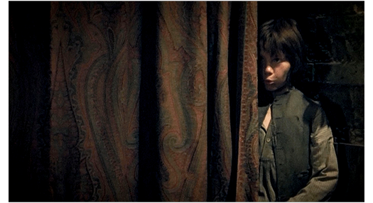 夜、オリバーが寝ていると、争う声が聞こえてくる。ナンシー:「ビル、放しておやりよ」。フェイギン:「ビル、窒息しちまう」。ビル:「騙しやがるのが、がまんならねぇ!」。ナンシー:「おやめよ。首を絞めるのは。縛り首だよ、ビル」。「まさか。勲章もんだぜ」。「放しなさいよ。お金くれるから。さあ、放して」。オリバーは声のする方にこっそりと近づいて行く。ビルが、フェイギンの首を絞めるのをやめる。フェイギンは苦しそうにむせる。オリバーはカーテンの陰からそれを見ている。ナンシー:「懲りないんだから。お金出して」。フェイギン:「出す。出すから」。「そうそう」。その時、ビルがオリバーに気付く。「何 見てやがる? てめぇ、目ん玉、叩き出してやろか?」。ナンシーが、「オリバー、寝床に戻って」と言うが、オリバーは、それを無視して「聞いてたよ」と答える。「怯えてたんで心配したんだ。何してたの?」。「心配ないの、オリバー。誰も怯えてない。冗談。気晴らし」。それだけ言うと、今度はフェイギンに、「でしょ、フェイギン? 気晴らしよね」と声をかけ、フェイギンも、「そうなんじゃ、ノリーや。パイが喉に詰まってな。サイクスさんが、揺すって取ってくれた」と嘘をつく。それでもオリバーの強い視線は変わらない。ビルは、「まだ、見てやがる。なんで見るんだ?」と脅すような声で訊く。ナンシーは、「新人なの、ビル。知らんのよ。今日来たとこ。だから、知らんの。ね?」とオリバーの後ろから守るように触る(2枚目の写真)。ビルは、オリバーの顔に自分の顔を近づけ、「このつら、見ろや。無垢そのもの」と言いつつ、指を近づける(3枚目の写真)。「『何も見てません、閣下』と言ってみろ」。オリバーはその通り口にする。ビルは、「気に入った〔I like him〕」と一言。そして出て行く。ナンシーは、「勇敢なのか、頑固なのか、きっと、両方ね」と声をかけ、ビルの後を追う。