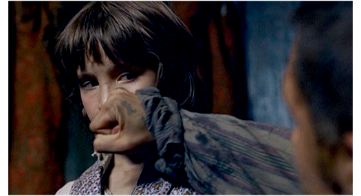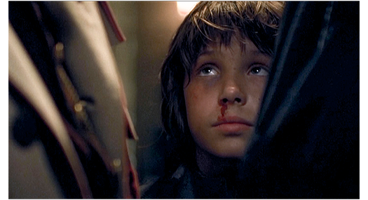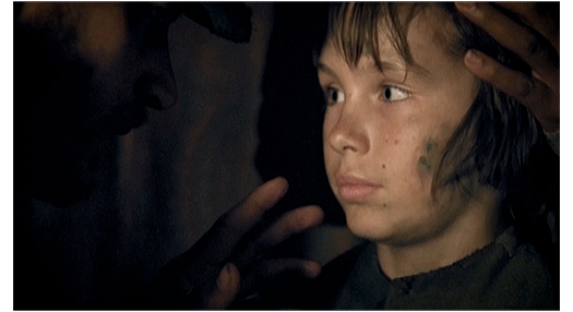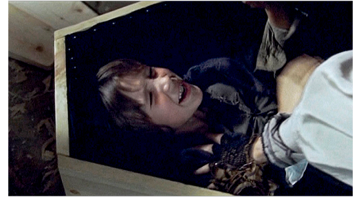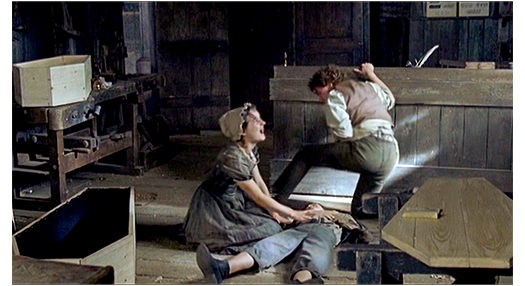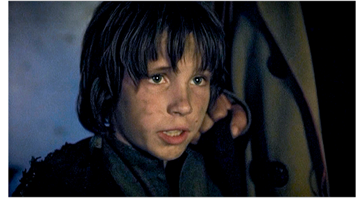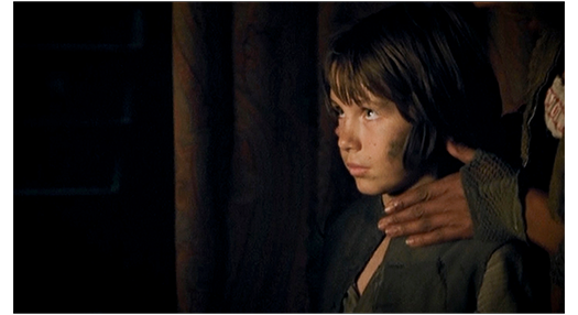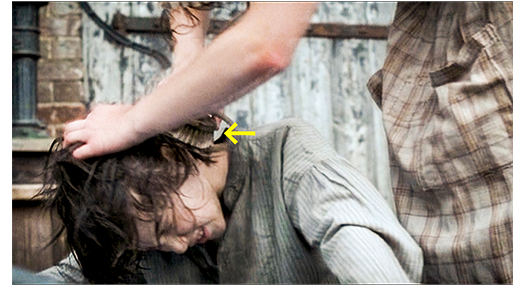 オリバーは、その夜、棺の近くの勘定台の下で寝る。翌日、オリバーは、床に寝させられ、頭の上に跨ったノアが屁をこき、下女がくすぐっている(1枚目の写真)。そこに入って来た夫人は、オリバーを見て、「なんで寝てる?」とノアに訊く。「知りません、奥様。休んどるんかも」。結局、「起きて。怠けるんじゃない」とオリバーが叱られる。2人だけになると、ノアは、「冗談の 分からん奴だ」と言う。「僕、何もしてない。放っといてよ」。「俺様は、放っときたくねぇのさ。哀れな孤児野郎。お袋も親爺もいねぇ。孤児で、絶対 確かなことは、どっかに、親爺がいるってことさ。死んじまったのは、お袋だけなんだ」。さらに、虐めは続く。「ご主人が 話しとった。バンブルの話だと、お袋には結婚指輪がなかった。てめぇは、用なしなんだ、救貧院。お袋の仕事 知っとーか? 売春婦だ。売春婦、知っとーか? はした金で、スカートを上げる女さ。死んだ方が、よかったんだ」(2枚目の写真)「なんせ、てめぇのお袋は汚らわしい、売春婦で…」。ここまできて、オリバーは、棺の蓋でノアを一撃する。そして、上に跨ると、「でらため言うな! 嘘つき! よくも、母さんの悪口を!」と、ノアの頭を床に叩きつける(3枚目の写真)。