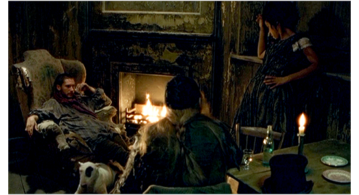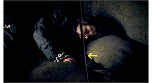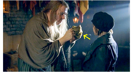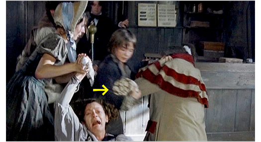 店に着いたサワベリーは、妻から文句を言われる。そこで、「悲しそうな顔つきだろ。そう思わんか?」と抗弁。「悲しい顔なんて、すぐできるわよ。倹約を強いる 旦那様が救貧院の宿なしに、浪費すれば。悲しい顔が好きなら、哀れな妻を見れば?」。「特売だった。この手の顔は、商売に役立つ」。「妻は、倹約のため、惨めな帽子で教会へ行ってるのよ。ヒソヒソ、ジロジロ、後ろ指まで さされてる。悲しい顔は、屈辱と絶望からの逃避なの」(1枚目の写真)〔帽子付きの夫人は40個も持っているが、「あたしは、我慢してるの、安ピカ物の帽子で」と口だけは達者〕。オリバーを買ったのを許す代わりに 新しい帽子を買う権利を獲得した夫人は、下女に「蚤の巣窟を、洗っておやり」「犬のティンカー用の食べ残しも」と命じる。オリバーは、頭をタワシでごしごし擦られて痛そう(2枚目の写真、矢印はタワシ)〔しかし、救貧院でも体は洗わないし、服は1着しかないので、頭を洗ったくらいではきれいになったとはとても言えない…〕。その後、オリバーは、床に座って夕食を頂く(3枚目の写真、矢印は犬用に取っておいた牛のすねの骨)。年上の奉公人ノアは、「やい、救貧院。てめぇは、棺桶のすき間で寝るんだ。死体には気い付けるこった、救貧院。昔、俺様が夜 起きたらよ、蛆虫が、目の穴から湧き出してた」と脅す。ここでも、オリバーは、「僕の名は、救貧院じゃない。オリバーだ」と挑戦的。