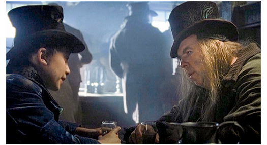 翌朝、ドジャーが外で卵を2個調達してくる。フェイギンは、それでベーコン&エッグを作り。その時、着替えをもらったオリバーが、颯爽とした姿で現れる。ドジャー:「粋だぜ」。フェイギン:「見違えるようじゃな、ノリー」。「ほんとにいいの フェイギンさん? 払えないよ」(1枚目の写真)。「些細なことじゃ、気にせんでええ」。オリバーは天井からぶら下がったたくさんのハンカチに気付く。「ハンカチ、一杯 あるね」。「ああ、きれいじゃろ?」。そして1枚取ると、「紳士になったみたいじゃな」と言いながら、丸めたハンカチをオリバーに見せる(2枚目の写真、矢印)。「みんなは、どこ?」。「皆 頑張っとる。働いてな」。「何やって?」。「あれやこれや。首尾よく儲け、食いぶちを稼ぐ。食べるためには必要なことじゃ」。「僕も 頑張るよ」。その後、フェイギンは2人に一緒の朝食を食べさせ、自分は出て行く。次のシーンでは、フェイギンとドジャーが居酒屋で話している。オリバーが、ドジャーを親友だと思って打ち明けたことを、すべてフェイギンに話している(3枚目の写真)。そして、最後に、「目玉焼き2個で全部聞けた。地獄耳だろ」と自慢する。フェイギンは、「お前さんは凄腕じゃよ」と褒める。