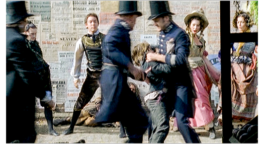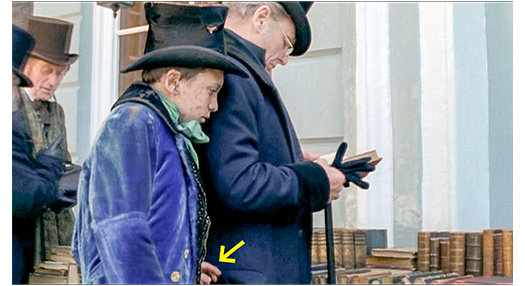 そして、オリバーは、いよいよ、ドジャーと一緒に出かける。「仕事 教えてくれるの?」。「そうだ」。「仕事って、何?」。「だから、今から教えてやるって」。仕事の内容は言わない。2人は外を歩いている。フェイギンの家の周囲と違って綺麗な場所だ。「幾つか原則を… 気転をきかせ。ためらいは禁物。指さばきは軽く。カモから目を離すな」(1枚目の写真)。これでは何も分からない。「『カモ』?」。「訊くんじゃねぇ、ノリー。見るんだ。あれだ」。2人の行く手には本屋があり、その店先で1人の紳士が本を立ち読みしている。「訊くんじゃなく、見て学べ。いったん始めたら、気い抜くな」。それだけ言うとドジャーは真っ直ぐ紳士に近づいて行く。オリバーは少し後ろで見ている。ドジャーは、紳士の上着のポケットに指を入れ(2枚目の写真、矢印)、財布を抜き取ると、ニコニコしながらオリバーの前を通り過ぎて行く。オリバーは、びっくりして身動きできない。その時、紳士が振り向き、ドジャーを見て、「わしの金を! あの子が盗った!」と叫ぶ。しかし、群集が追ったのは、紳士が期待したようにドジャーではなく、別方向に逃げ出したオリバーだった〔原作では、紳士はオリバーが盗んだと思う〕。紳士は、「違う、そっちじゃない、あっちの子だ!」と叫ぶが、誰も聞いていない。紳士(ブラウンロウ氏)は、「エドワード! 間違った子を 追ってるぞ!」と大声で言いながら反対側に走って行く。オリバーは必死に逃げるが、最後には警官に捕まる(3枚目の写真)〔エドワードは紳士の孫〕。