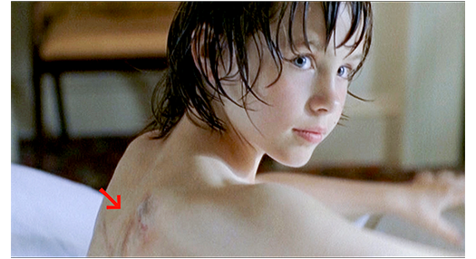 画面は真っ白になり、再び元に戻ると、老婆(ベドウィンさん)と若い女性(ローズ)が誰かを見ている。女性が、「オリバー」と呼ぶので、カメラの側にオリバーがいることが分かる。カメラは切り替わり、清潔なベッドで眠っている汚いオリバーが映る。オリバーはびっくりして飛び起き、「僕、死んだの? ここはどこ? 誰なの?」と怯えて尋ねる。「ローズよ。あなたは死んでいないの、オリバー。生きているわ」(1枚目の写真)「それに、今は安全なの。安心なさい」。その後、夕食のシーンに変わる。ブラウンロウ氏が、「ベドウィンさん、少年の具合は?」と尋ねる。ベドウィンさんは食欲が出て来たと伝え、ローズには「古い子供服を見つけました」と話しかける。それを聞いたローズは、「伯父さま、退席しても?」と訊く。ベッドの上には、お風呂に入ってきたオリバーがタオルを巻いて座っている。オリバーがベドウィンさんの持ってきたシャツを着ようと上半身裸になると、背中には一面に鞭の傷跡が残っている。それを見たローズはショックを受ける。それに気付いたオリバーは、「大丈夫だよ。もう痛くない」と安心させる(2枚目の写真、矢印は傷跡の一部)。ローズはオリバーが慣れないシャツを着るのを手伝う〔貧民用の物と違い構造が複雑〕。ローズが、「面倒だわね?」と訊くと、オリバーがニッコリする(3枚目の写真)。
