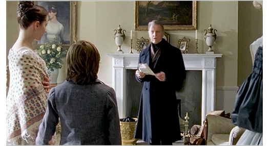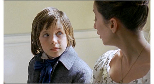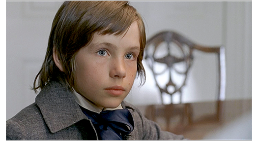 少し大きめの古着とはいえ、一応ちゃんとした子供服を着たオリバーは、ブラウンロウ氏の前に連れて来られる。「回復したのを見て、私も嬉しいよ、オリバー。もっと元気になって欲しい」(1枚目の写真)。「ありがとうございます。裁判所で助けてくれて、ありがとう」。「当然のことだ」と微笑む。それだけ言うと、前から下がらせる。ブラウンロウ氏のそっけない態度に、部屋から出たオリバーは、「ベドウィンさん、僕、嫌われたの?」と尋ねる。その理由は、部屋に戻ってからたっぷり訊かされる(2枚目の写真)。昔は親切で寛大な人だったが、悲劇が起きてすっかり変わったこと。しかし、その先が、曖昧。「男女が恋をした。でも、認めてもらえなくて強い反対に遭ってしまう。でも、二人はお互いに確信してたの。真に本当の愛だと」。そして、最後は、「悲嘆、絶望、失踪」。後で分かることは、ブラウンロウ氏にはウィリアムという息子がいて、結婚し、エドワードという子が生まれた。何らかの事情でウィリアムはアグネス・リーフォードと恋愛関係になり、ウィリアムは死に、アグネスは身ごもり、庶子オリバーを産んで死んだ。そして、ローズはアグネスの妹にあたる。なぜ、ローズはブラウンロウ氏のことを伯父〔uncle〕と呼んだのだろう? それは、その直後のローズとオリバーの会話で解明する。「ほんとの伯父さんなの?」。「そう呼んでるだけ。ブラウンロウさんは後見人なの。姉と私を身内のように… 私たちには家族がいないから。両親もね」(3枚目の写真)。「お姉さんは?」。「ここには、いないわ」。