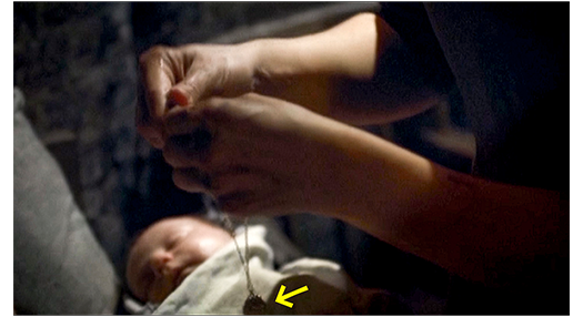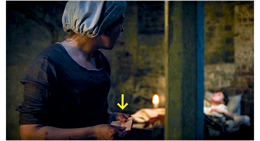 映画の冒頭は、名匠デヴィッド・リーン監督による1948年版へのオマージュから、嵐になびく大木の枝のシーンから始まる。しかし、似ているのはこの部分だけ。後は、独自のオリバーの世界を開拓している。産気づいた女性が真っ暗な激しい雨の中を歩き何とか救貧院の門まで辿り着き、鐘を鳴らして助けを求める(1枚目の写真)。柵の上には「マッドフォッグ〔Mudfog〕救貧院という文字が見える〔ディケンズによる『The Mudfog Papers』(1837)から取られた名前。マッドフォッグは架空の町で、ディケンズが若い頃を過したチャタムに比定されている。しかも、最初に『オリバー・ツイスト』が月刊誌に連載され始めた頃は、オリバーの生まれたのはマッドフォッグだとされていた(出版にあたり削除された)。この映画では原点に戻っている。ただし、原作ではロンドンまで約75マイル(120キロ)とあり、チャタムの倍以上の距離にある〕。中に運び込まれた女性は、医師の手で無事に男の赤ちゃんを出産する。その部屋にいるのは、医師、婦長のコーニー、手伝いのサリーの3人。女性はまだ生きているのに、コーニーはサリーに「済んだら、葬儀屋に棺桶の手配を。服は、泥を落として消毒したら、うちがもらう。ペチコートも全部。この娘には、リネンやレースは要らんけん」と言って医師と一緒に出て行く〔コーニーは訛がひどく、服装も貧弱。原作や、他の映画ではコーニー夫人は、元院長の未亡人というご身分だが、この映画では、「子供時代をこの救貧院で過した女性」という設定で、「社会の階段」を上がることに飢えたさもしい女性〕。サリーと2人だけになった時、女性は、「お財布に手紙が… お願い、郵送して。この子のために、どうか」と頼む。サリーは、「うちの役目じゃなか」とつれない。「郵送して。必ず。そして、この子に会いに来る人に伝言して。こんな顛末ですが、アグネスはご親切を 忘れませんと。どうか、手紙を出して。お願い」と頼む。サリーが、小さな袋の中を捜すと、そこには小さな封筒が入っていた。宛先は、「ロバート・ブラウンロウ様/ネプチューン広場6番地/ロンドン」(2枚目の写真、矢印)。サリーがアグネスのところに戻ると、もう彼女は死んでいた。サリーは、アグネスが首にかけていた金のロケット付きのネックレスを奪う(3枚目の写真、矢印)〔手紙を渡すのは、この映画のみ〕。