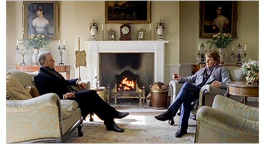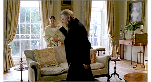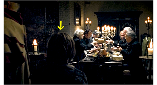 ここで、順序は入れ替わるが、その日のローズの行動を、まとめて取り上げよう。最初は、3人で酒場に入った後に挿入されたシーン。ローズとベドウィンさんが貧民街でオリバーを捜している(1枚目の写真、矢印はローズ、その左がベドウィンさん)。ローズは、1人の男に、「済みません。助けて下さい。男の子を 探してるのです」と声をかける。男は、もう1人の連れに向かって、「聴いたか? 『男の子〔boy: 若者、男の意味もある〕』を お探しだとよ。俺じゃ駄目かい、お嬢さん?」。もう1人は、「いんや、俺を ご指名さ。相性ばっちりだ」。如何にもスラムらしい品の悪さ。ベドウィンさんが「恥さらし!」と非難すると、「虫ずが走るぜ」「醜い くそ婆」と罵り、去って行くローズには、「白い手袋の嬢ちゃん、待てよ」「なあ、一緒に汗でもかかねぇか」と淫らな言葉を投げる。2番目は、オリバーとナンシーの会話の次に入るシーン。家に戻ったローズは、泥まみれになった靴を脱ぎ、着替えるために2階に上がって行く。ローズは階段を上がったところで、モンクスに出会う(2枚目の写真)。「まさか、お見えになるとは。嬉しい驚きですわ」〔これは建前〕。「嬉しいのは僕です」〔こちらは本音〕。モンクスは、旅の成果はゼロだったと嘘をつく〔旅になど行かず、フェイギンと会っていた〕。3番目は、次の節の後に入る場面だが、関連しているので先に取り上げよう。夕食の席。いつもと違い、モンクスもいる。ブラウンロウ氏から「今日は、何をしたのかね?」(3枚目の写真)と訊かれたローズは、「美しいレースが幾つもあって決めかねました。明日、ベドウィンさんと、もう一度行きます」と答える。そこに、モンクスが、「ご一緒できれば、幸いです」と口を出し、ブラウンロウ氏も「いい考えだ、エドワード」と賛成するのでローズは窮地に立つが、「ご一緒 頂けるのは光栄ですが、婦人服も、同時に見たいのです。ご好意は感謝しますが、私としては、女同士で行きたいのです」と上手に断る。