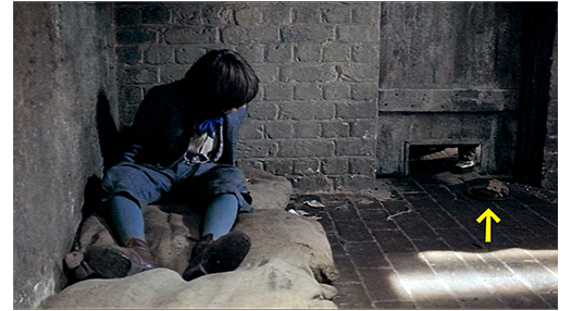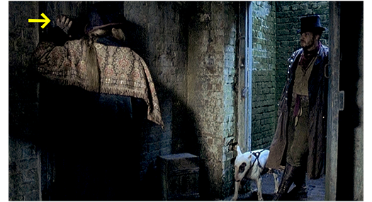 ドジャーが道沿いの露店からパンを1つ盗む。次いで、オリバーが閉じ込められた小部屋の扉の下の小穴が開き、そこからパンの切れ端とソーセージの載った皿が入れられる(1枚目の写真、矢印)。扉の外では、ドジャーが木箱の上に乗り、扉の上部にある覗き穴の蓋を開け、中を見る(2枚目の写真)。ドジャーは「ノリー」と声をかけるが、オリバーは無視する(3枚目の写真)〔理由は後で分かる〕。