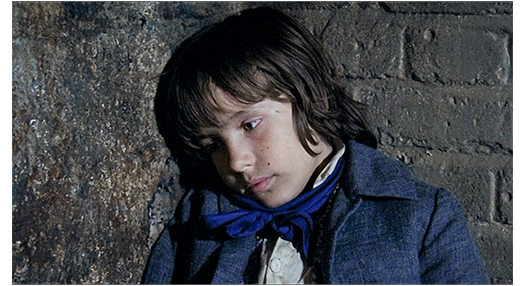 オリバーが、本代〔原作では5ポンド札1枚〕と手紙を持って出かけると、待ち構えていたナンシーが呼び止める。「とても立派ね、オリバー。凄いわ」(1枚目の写真)「ごめんね。ちょっと、酔ってるの。酔ってないと、とてもできないから」。「『できない』って、何を?」。「一緒に、あの角まで行ったら、教えるわ」。「無理だよ。会う人がいる」。「一緒に来て」。ここに至ってオリバーにはピンとくる。そして、目を細めて、「『秘密の友』って、ナンシー?」と訊く(2枚目の写真)。オリバーは、母のことが何か分かるかと思いナンシーについて行く。しかし、途中でビルがオリバーに麻袋をかけ、そのまま路地の奥にある小部屋まで運ぶ。袋から出されたオリバーは、ビルに飛びかかろうとするが(3枚目の写真)、強すぎて相手にもならない。「何で、連れてきた!」と殴りかかるが、リーチが短くて届かない。ビルに、「そうだ、ノリー。左右のパンチだ。とことん、殴れ!」と遊ばれるだけ。フェイギンが「なあ、ビル、もう十分じゃろ」と止めさせ、重い扉が閉められる。オリバーは、「出せ! ここから出せ! 出せ!」と、扉を叩き続ける。