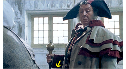 オリバーは街道を通らず、森を抜け、草原を歩き、もう安全と思って街道に戻る。しばらく歩いていると、行く手から四頭立ての馬車が高速で近付いて来る。オリバーは急いで太い幹の後ろに隠れる(1枚目の写真)。通過していた馬車に乗っていたのは1人の紳士。特徴は、球状の銀の玉が付いた杖を持っていること(2枚目の写真、矢印)。その直後、カメラは車内に切り替わり、男の手に持った手帳には各地の救貧院の名前が書かれ、横線で消されている。このことから、男が、救貧院を順番に訪れて何かを調べていることが分かる。男の言った先はマッドフォッグ。次のシーンでは、バンブルが、「その月の誕生は1人だけです、モンクスさん。この場所で、アグネス・リーフォードが出産。オリバー・ツイストと命名。わしは、名前を付けるのが得意でして」と説明する(3枚目の写真)。コーニーが、「娘は産褥熱で死にました」と付け加え、「模範収容者が、つきっきりでした。その女を呼びます」とサリーを呼ぶ。サリーは、手紙とロケットを秘密にしておきたいので、ちょうど罹り始めた結核の咳を強調し、「なんも覚えてません、婦長さん」で押し通す。モンクスは、オリバーが出奔したことを聞きがっかりするが、情報料として金貨3枚を机の上に投げて寄こす。コーニーは、「子供は行方不明ですが、何か やらかすに決まってます。バンブルさんと、うちの耳に入るかも。連絡先を残されたら、どうです?」と提案する。
