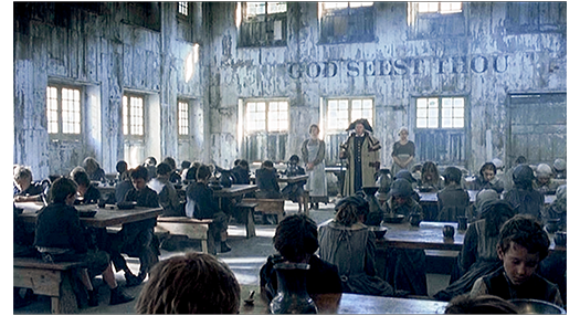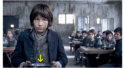 本編は、子供たちが槙肌(まいはだ)〔古い麻綱をほぐしたもの。木造の軍艦が敵艦の砲撃で船体に穴が開いた時に詰める(漏水対策)〕作りをさせられているところから始まる。オリバーがくしゃみをすると、教区吏のバンブルが、「ツイスト、くしゃみするな」と叱って頭を叩く。オリバーは麻綱を食べようとする向かいの子に、「やめろ。食べるな」と注意する。「腹ぺこだ」。「みんなもだ。やめとけ。ぶたれるぞ」。しかし、お腹が空いた子は、麻綱を口に入れてしまう。見張っていたサリーが、「そこ、バンブルさん!」と叫ぶ。バンブルは、「泥棒!」と言って、口から麻綱を取ると、「盗みの、現行犯だ!」と、髪の毛をつかんで引きずっていく。コーニーは、「罰して、バンブルさん。見せしめのため、どうか、厳罰を」と声をかける。救貧院のひどい実態がよく分かる。そして、お馴染みのお粥の場面。食堂の正面には、「神は見ておられる〔God Seest Thou〕」と書かれている(1枚目の写真)。バンブルの杖を合図に子供たちは一斉に薄い粥を食べ始める〔食事は、毎日3回薄い粥、週に2度たまねぎ、日曜にパン半切れ〕。オリバーの粥には蛆がいたが、平気で蛆まで食べる。オリバーは、さっき罰せられた子が元気ないのを見ると、誰かが言わなくちゃ と決心し、椀を持って立ち上がる。バンブルの前まで来ると、「お願いします。もう少しください〔Please sir, I want some more〕」と頼む(2枚目の写真、矢印は皿)。「何だと? 何と言った?」。「こう言ったんだよ。お願いします。もう少しくださいって」(3枚目の写真)〔“I said” と言うのはこの映画だけ。強調していて、逃げ腰ではない〕。