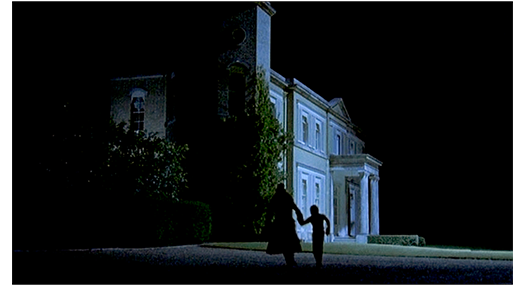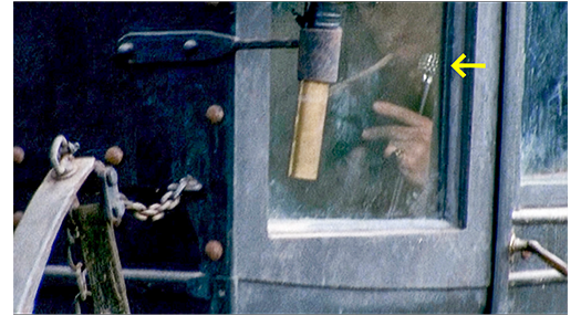 遠くで時を告げる鐘が鳴り、ナンシーはビルを起こそうとする。オリバーは、「僕、やりたくない。どこにも行きたくない」と訴えるが、ナンシーは「彼が、世話してくれる。あんたが役に立てば立つほど 大事にしてくれる。悪い人じゃないの」と説得する。そして、場面は一気に真夜中の郊外の館を目指して歩いて行く2人に変わる(1枚目の写真)〔原作では、チャーツィー(Chertsey)にある金持ちの館ということになっているが、そこはフェイギンやビルのいる場所の西南西32キロの地点。朝5時半過ぎに家を出て、2回荷馬車に乗り、2回仮眠をとり、夜の2時に着く。だから、映画では、もっとずっと近くの館になる〕。オリバーは少しだけ下を開けた窓の隙間から 中に入り込む。そして、「玄関に向かえ。ぐずぐずするんじゃねぇ」と指示される(2枚目の写真、矢印はビルの頭)。オリバーが大階段の前を横切って玄関まで行き、ドアを開けようとした時、階段を誰かがそっと降りてくる。ドアが開いてビルが半身を入れると、銃身が上がる。階段を銃を構えて降りてきたのは執事だった。それに気付いたビルは、オリバーに「来い」と命じる。オリバーが、「何?」と振り返り、ビルがその手を取って、引きずり出そうとした時、銃が2度発射され(3枚目の写真)、その度にオリバーが悲鳴をあげる。ここで、ミニ・シーリズの第2回目(1回目の半分の時間)が終わる。なお、この最後の節の前と途中には、救貧院での一連のシーンの前半があり、それについては、次々節で取り上げる。