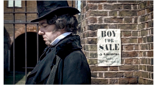 葬儀屋のサワベリーが救貧院の門の前までくると、貼り紙がある(1枚目の写真)。「子供売ります/5ギニー/バンブルまで」と書かれている〔原作では、オリバーは報奨金5ポンド付き。ほとんどの映画がそれを踏襲している〕。シーンは、サワベリーとバンブルの価格交渉に変わる。サワベリーは開口一番「2ギニー」。バンブルは「2?」と唖然とする。「チビだろ」。「だから、場所も取らん。売値は5だ」。「2だ」(2枚目の写真)。「4。これが最後だ。どっちか決めろ」。サワベリーはさっさと出て行く。バンブルは慌てて止めて「3で」と言うが、サワベリーは「2だ」と譲らない。「まるで追剥だな」〔因みに、当時の労働者の平均月収は3ギニー程度〕。サワベリーは、救貧院の死者(大人1人、子供1人)の棺桶を乗せた荷車をオリバーに牽かせて店に戻る(3枚目の写真)。