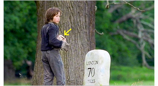 その後は、オリバーが歩く様子が映される。晴れた日ばかりではなく、どしゃ降りの日も。パンはなくなり、靴は壊れて捨ててしまう。結局、裸足で歩き続けることに。どこかの納屋の入口で雨を凌いで寝ているシーンもある(1枚目の写真、矢印は裸足)。オリバーは、その後、ロンドン市内に入る。馬車の行き交う舗石道路の上を歩く(2枚目の写真、矢印は裸足)。