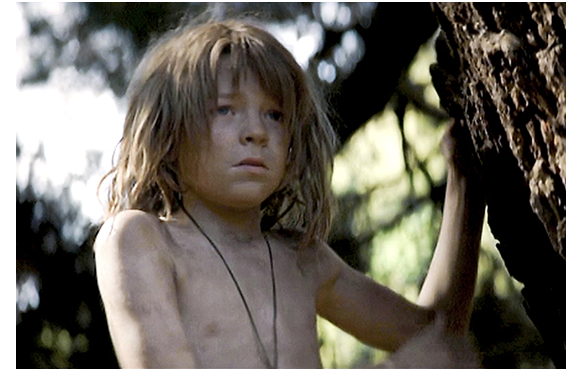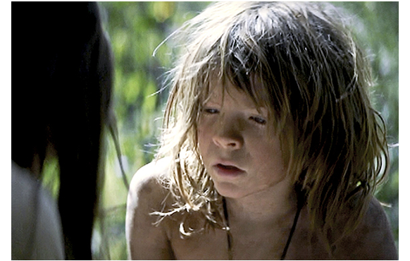 ピートは、ワザとナタリーが付いて来やすいように音を立て、自分のツリー・ハウスまで誘導する。木の上から自分を見ている少年(1枚目の写真)に気付いたナタリーは、果敢に登っていく。大木の半分ほどまで登ったところで、枝に足をかけようとして滑ってしまい、悲鳴を上げる。ピートは上から飛び降りてくると、ナタリーを持ち上げようとするが(2枚目の写真)、枝が折れてしまい、2人とも落下。途中で、何度もぶつかり、ナタリーは足をケガしただけで済んだ。ピートはもちろん何ともない。心配そうに、ナタリーを見るピート(3枚目の写真)。ナタリーは、「あなた いくつ?」と訊く。ピートは、昔の年齢しか知らないので「5つ?」と答える。「5歳よりは、ずっと大きいわ」。そして、「名前は?」とさらに訊く。「ピート」。「そっちは正しそうね。私はナタリー」。