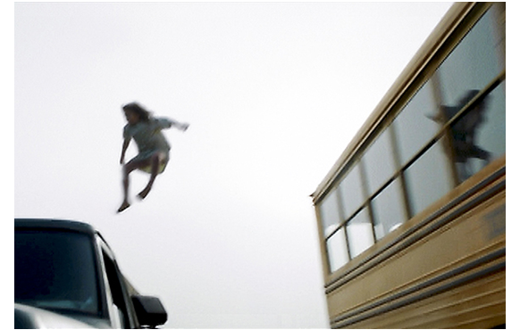 病院を逃げ出したピートは、素足のまま道路を走り、交差点に来て走ってくる自動車に驚いて止まる。それから また走り出し、小さな町のメインスリートの歩道を駆け抜け、犬に吠えられると 唸り声で逆に脅し、停まった車の上を歩いて越え、パトカーが先回りして停まったので、通りがかったスクール・バスのリア・ウインドウにつかまって逃げる(1枚目の写真)。そして、バスの屋根に上がる(2枚目の写真)。パトカーが後ろから付けて来たのに気付くと、反対側から来た車の屋根にジャンプ(3枚目の写真)。それを見たスクール・バスの子供達は大興奮。その車から飛び降りて路地に走りこんだら、そこは突き当たりだった。