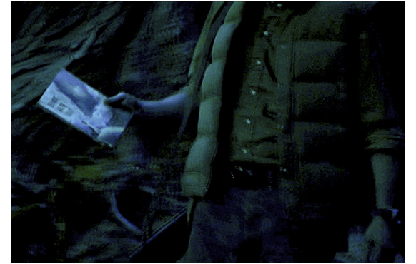 ある日、ドラゴンと一緒に森の外れに来たピートは、森林警備隊員のグレースが森に入ってくるのを見つける。このあたりずっと台詞が全くなく、視聴覚障がい者向けの音声解説でも言及されないので、ピートにとってこれが6年ぶりの人間との再会かどうかは分からない。ピートは見えないように後を追いかけ、興味深げに行動を見守っている(1枚目の写真)。その時、グレースは地図と照合するためコンパスを取り出した。それは、ピートにとっては見たこともない宝物だった。そこで、グレースが木に塗られた伐採用の赤の目印を、青いスプレーで消している間に、地面に置かれたバッグからコンパスを盗んでしまう。そのコンパスをドラゴンに見せると、くんくん嗅いでくしゃみをする。その勢いで吹き飛ばされたピートが、体中についた鼻汁に触りながら「エリオット」と言って笑う(2枚目の写真)。ここで怒らないところがいい。ピートは地面に落ちてしまったコンパスを拾い上げ、蓋を開けると中に1枚の写真が入っていた(3枚目の写真)。