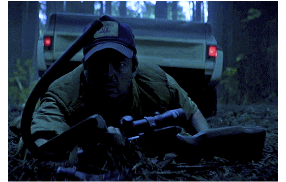 その頃、森では、ギャビンが大木の脇にある洞窟に気付き、中に入って行く。ドラゴンも少し離れてそれを見ている。ギャビンは、ピートの大切な絵本を見つけ、それを手に持って洞窟の外に出てくる(1本目の写真)。それが友達の宝物だと知っているドラゴンは、渡すものかとギャビンに襲いかかる。必死で逃げるギャビンと仲間の2人。ドラゴンは木を倒しながら、それを追跡する。2人がトラックに辿り着き、ギャビンが荷台に飛び込んでライフルを向けると、ギャビンを放り投げ、地面に叩き付ける。ライフルはぐにゃりと曲がり使い物にならない(2枚目の写真)。そのギャビンの前にドラゴンが初めて全身像を見せる(3枚目の写真)〔相手がドラゴンだと分かる〕。ドラゴンのくしゃみで鼻水まみれになったギャビンは、必死の思いでトラックに乗って逃げ出す。