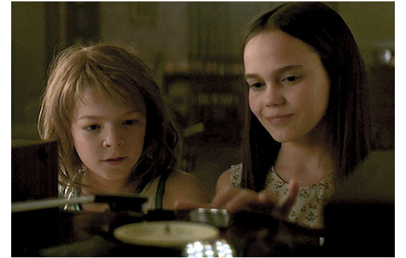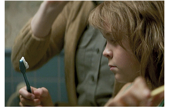 一方、ナタリーは、ピートにレコードをかけて見せている。ピートは回転するレコード盤に触れ、音の調子が変わるのを不思議そうに見ている(1枚目の写真)。その後で、飾ってある写真をピートに見せる。「これが私で、これがパパ。こっちがパパの弟で、これがグレース。家族よ」。なぜ母の写真がないのか? なぜ恋人なのにグレースの写真があり、「家族」なのか? 最初にこの映画をざっと観た時、私はジャックとグレースは夫婦だと思った。しかし、解説を見ると、ジャックとグレースは恋人で、後になって結婚し、ピートを養子にする、と書いてある。どこか変だ。次が、歯磨きのシーン。グレースとナタリーに挟まれ、ピートが困ったように歯ブラシを持っている(2枚目の写真)。ジャックは、居間で、自分の宝物と同じ絵本を見つけ、さっそく開いてみる。そこに近付いてきたグレースが、子犬を指して「これが、エリオットなの?」と訊く。首を振るピート。「エリオットは人間?」。「ううん」。「じゃあ、何なの?」。ここで、保安官からグレースに電話が入る。ピートの両親の事故の新聞記事を見つけたので、明朝、福祉局の人間が引き取りに来るという内容だ。