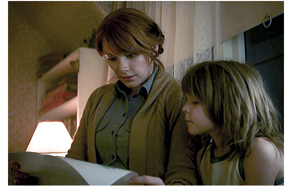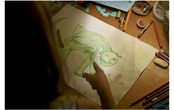 そこに、グレースが入って来て、ピートと2人で話したいと言う。グレースは、「森に入った時のこと 覚えてる?」と尋ねる。「ずっと昔のことなんでしょ?」。しばらく考えたピートは、「ボクたち、“ぼうけん” してた」と答える(1枚目の写真)。「私は、あなたよりちょっと大きくなってから、母を亡くしたの。だから辛さが分かる。だから、知ってて欲しいの、あなたは一人じゃないわ」。「知ってる。エリオットがいるもん」。「エリオットのこと、話してくれない? どんな人?」。ピートは、さっき描いた絵を持って来てグレースに見せる。「ボクの友だちだよ」。「これがエリオットなの?」(2枚目の写真)。「きっと、特別なお友達でしょうね」。「彼は人間が嫌いなんだけど、あなたのことは好きになるよ」。「そう?」。「明日、会えるよ。おウチに戻った時に。一緒に来るんでしょ?」。明朝、福祉局の人間に引き渡すことになっているので、複雑な気持ちで「もちろん」と答えるグレース。それを聞いてピートが微笑んだのを見て、「あなたはとっても勇敢よ。知ってた? あなたは、これまで会った中で、一番勇敢な子よ」。以前、母に言われた言葉と全く同じだ。それを聞いたピートはニッコリ笑ってグレースに抱き付く。グレースもしっかり抱きとめる。多分、この時、グレースは決心したのであろう。明日は、福祉局に引き渡すまいと。グレースは、その夜遅く、父の家に入って行くと、父も耳ざとく起きてくる。そして、少年のことを尋ねる。「何年、森にいたって?」。「6年よ」。「6年? 森では 誰も6年は生きていけん。1人ではな」。そこで、グレースは持ってきた絵を見せる。それを見た父は、かつて自分が森で遭ったドラゴンの絵を見せる。「私が幾つの時、描いたの?」。「たぶん、5歳か6歳。お前の母さんが亡くなる少し前だ」。そして、その時のことをグレースに話し始める(3枚目の写真)。グレースの父は、ピートがドラゴンと一緒だったことを固く信じたし、以前は父の話を信じていなかったグレースも信じるようになった。