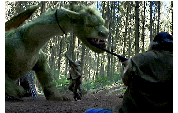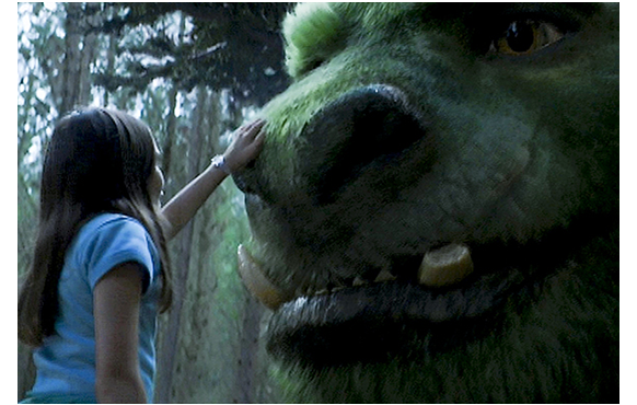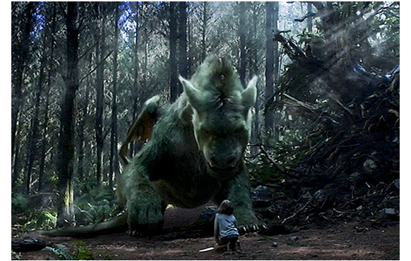 その時、仲間を呼ぶ狼の遠吠えが聞こえる。ピートには、それが何かは分からなかったが、唸る声が怖いのは自然の本能だ。唸り声から後退して、森の中に駆け込む。高い木に囲まれた森の中、周辺を取り囲む狼たち。絶体絶命の状況だ。その時、森の奥からメリメリと木を倒しながら、ズシンズシンと何かが近付いてくる。狼たちは逃げていく。そして、森の中から黒い大きなシルエットが現れた(1枚目の写真)。巨大なその怪獣は、犬のような顔を持ち、長い尾を持っていた。そして、ゆっくりと近付くと、長い首をピートの方に伸ばす(2枚目の写真)。ピートは、「ボクを食べちゃうの?」と怖そうに訊く(3枚目の写真)。その言葉が理解できたかどうかは分からないが、怪獣は、ピートが思わず落としたバックパックを頭でピートの方に押して寄越す。これで害意のないことに安心したピートが、怪獣の前脚に触れると、全身の毛が鮮やかな緑色に変わった。怪獣は周辺の色と完全に同化して透明になったりもできるが、緑色は嬉しい時のカラーだ。ピートは、自分が来た道路の方を一度寂しげに見やると、怪獣が差し出した前脚に乗る(4枚目の写真)。勇敢に、冒険の一歩を踏み出したのだ。怪獣はピートを護るように抱くと、大きな翼を広げ、夜空へと飛び立って行った。怪獣はドラゴンだった。