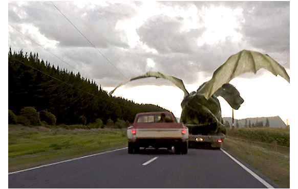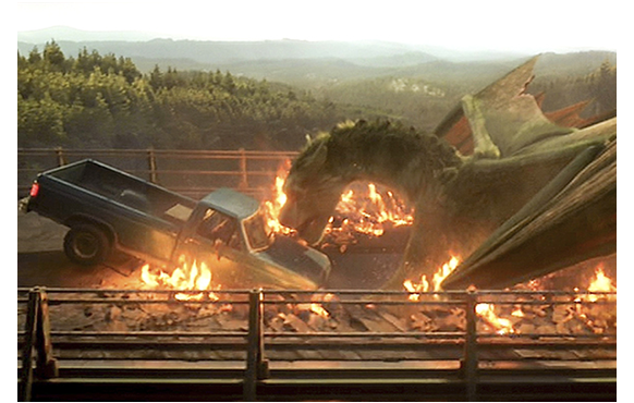 グレースとジャックのトラック、パトカー、一足遅れて〔グレースが車のキーを捨てた〕ギャビンのトラックが、トレーラーの跡を追う。狭い道なので、ギャビンは道路脇の草地を無理矢理走り抜けて先頭に出ると、トレーラーの前に出ようとする(1枚目の写真)。追い抜きざま、「停めろ!」と叫び、グレースの父が「断る(Not a chance)」と言うと、「そいつは、俺のドラゴンだ!」と怒鳴る。そして、そのまま加速して追い抜くと、ずっと先の渓谷に架かる橋の手前まで行き、車を横にして停め、その前に立ち塞がる(2枚目の写真)。グレースの父はトレーラーを停めようとするが、ドラゴンが何とか飛び立とうと暴れた際に、ブレーキのホースが抜けていた。だから、ブレーキペダルを踏んでも全く効かない。トレーラーは真っ直ぐトラックに突っ込んで行き、その巨大さからトラックをふっ飛ばし、橋を渡り終えてしばらく走ってからエンジントラブルで停止した。