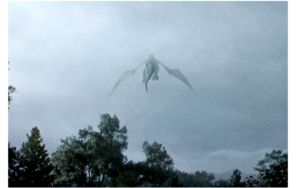 ピート、ナタリー、グレースの父が崖っぷちに駆け寄る。心配する相手は三者三様だ。幸いに谷底を覆う霧の中から、グレースとジャックを乗せたドラゴンが力強く羽ばたいて上昇、道路の少し先に着地した。ピートはまっしぐらにドラゴンに駆け寄り(1枚目の写真)、エリオットはそのピートを胸に抱きしめる(2枚目の写真)。そこにヘリコプターが1機飛んで来るのが見える。ピートは「分かってるよ」とドラゴンに声をかけると、グレースが止めるのを無視して、そのまま一緒に飛び去った。夕陽に向かって飛ぶドラゴンの姿が美しい(3枚目の写真)。