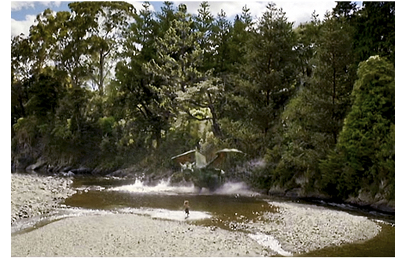 ピートとドラゴンは森に入り、ドラゴンは姿を消してピートを困らせる。ドラゴンの居場所を見つけて嬉しそうな顔のピート(1枚目の写真)。この後、ピートは崖から飛び降り、それを追ったドラゴンが背中に乗せて宙を飛ぶ(2枚目の写真)。まさに『アバター』や『ヒックとドラゴン』の世界だ。渓流に沿って飛ぶドラゴンを上空から捉えるアングル(3枚目の写真)もなかなかいい。