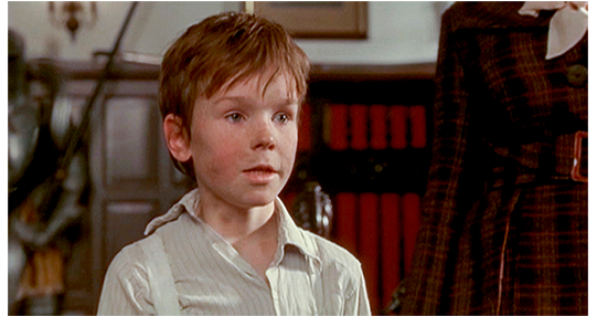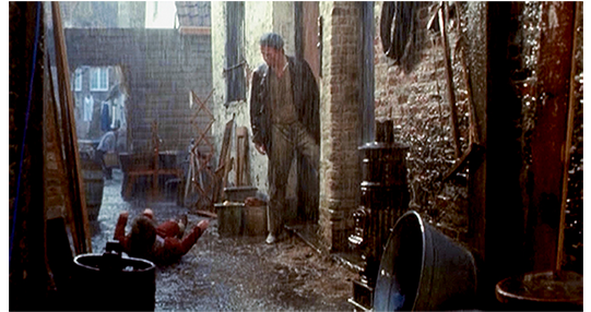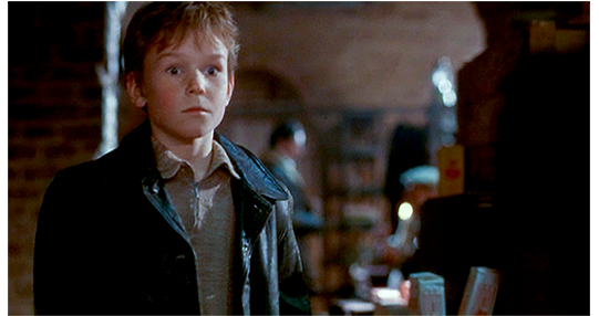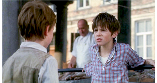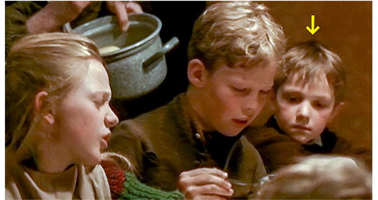 ピチェは、そのままスプルートに同行する。スプルートが入って行ったのは狭くて汚い路地。ドアの外では、赤ん坊を抱いた母親が、「やっと、帰ったのね」と言い、布をめくると当然のようにパンを取り出す。部屋の中には2人の小さな子供もいる。母親は、パンの端を切りながら、「その子、誰?」とスプルートに訊く。「ピチェ・ベルさ」。「ああ、新聞で有名な子ね」と言いながら、切り取ったパンの半分を女の子に渡す(1枚目の写真、矢印はパンの半分、母親の左手にも残りの半分が握られている→後で、赤ん坊に渡す)。母親は、「スプルートが、誰かを連れてくるなんて」と言いながら、次に切った半切れをスプルートに渡す。スプルートはそれを、そのままピチェに渡す(2枚目の写真、矢印はパン)。それを見た母親は、「ほんとに、お友達なのね」とスプルートを褒める。スプルートは、靴をもらったり、新入生としてクラスに連れられて行った際のピチェの奮闘ぶりを見て以来、ピチェの崇拝者になっていた〔彼は、トイレの拭き紙用に盗んできた新聞から、「お尻を拭くと畏れ多い」ので、ピチェの記事を切り取って壁にっている〕。ピチェがパンを食べていると、そこに父親(ヤン)が帰ってくる。ヤンは、「せっかく食い物を手に入れたんだ。他人にやるな!」と母親に怒鳴ると、ピチェを見て、「ここで、何してる? さっさと出てけ、この小僧!」と言い、服をつかんで、雨が滝のように降り始めた路地に放り出す(3枚目の写真)。冷酷、かつ、粗暴な男だ。