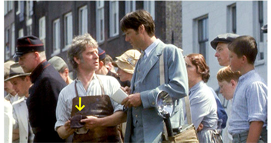 倉庫から持ち出した品がなくなってしまう。そこで、ピチェは、何か取って来ようと「強盗の巣」に1人で向かう。しかし、近づいていくとクロックとトゥーンの声が聞こえる。ピチェは、こっそりと近づいて様子を伺う。2人は在庫が減ったのをいぶかり、「誰なんだろう?」。「サツじゃ、ないのか?」と疑っている。「もしかしたら。この前の農場みたいに」。その時、ヤンが姿を見せ、「俺が警告しなかったら、あげられてたぜ」とお仕着せがましく言う。「俺に感謝しろ」。トゥーンも負けていない。「お前じゃなく、息子にな」〔スプルートの情報で、 「お宝」をロッテルダムの地下倉庫に移動できた〕。それを知ったピチェはびっくりすると同時に、スプルートの変心の謎も解ける(1枚目の写真)。そのうち、ヤンは、「見ろ、ダイヤモンドだ」と木箱に入ったたくさんのダイヤモンドを仲間に見せる。そして、「今夜10時にツェッペリン号に持って行く」と話す(2枚目の写真、矢印はダイヤモンドの箱)「明日から、俺たちは大金持ちだ」〔ツェッペリン号は、アメリカの新聞王ウイリアム・ハーストが借り切って世界一周をしていて、ロッテルダムに立ち寄るという設定。ツェッペリンが造られたのは1928年なので、これも、この映画の舞台を1930年代とする根拠になっている〕。その時、スプルートが姿を見せたので、びっくりしたピチェが体を引っ込め、物に触れて音がする。盗賊たちは急に警戒。スプルートが確かめに来る。スプルートはピチェと目が合い、仰天する(3枚目の写真)。ピチェは黙ってろと指を口に当てるが(4枚目の写真)、その時、靴墨で黒くなった手の平が見える(矢印)。それを見たスプルートは、以前、自分の家の前に置かれた紙包みの「黒い手」が、ピチェのものだったと気付く。ピチェは、スプルートが裏切ったにもかかわらず、紙包みをくれた。それに感謝したスプルートは、ヤンから「何か見たか?」と訊かれても、「ううん、何も」と答える。