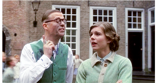 ピチェのクラスにヨゼフが来て「文法」を教えている。「Ik ga naar school(学校に行きます)。時制は何だ〔Welke tijd is dat〕?」〔“Welke tijd is dat” は「何時だ?」という意味にも受け取れる〕。ピチェの親友が、「9時半です、先生」と答え、生徒たちは笑い、ヨゼフはチョークを折る。次の女生徒は、正しく、「現在形です、先生」と答える。「これはどうだ? Ik ging naar school(学校に行きました)」。ピチェのもう一人の友達。「えーと、過去形?」。「これはどうだ、Ik ben naar school gegaan(学校に行ってきました)」。その時、ヨゼフはよそ見をしているピチェに気付く。そして、「ピチェ!」と大声で呼び、「先生は、何て言った?」と訊く。「どこで?」。「今、ここでに決まっとる! 耳が ついてるのか?」。ピチェは耳を触ってみる(1枚目の写真)。「私は、何て言った?」。「『耳が ついてるのか?』って言ったよ」〔ある意味では、正しい答え〕。怒ったヨゼフは、つかつかと歩み寄ると、ピチェの耳をつかみ、「お前は、つんぼか?!」と大声で怒鳴る。「耳がボーンとしちゃった」。「私は、何て言った?」。「分かんない」。「お前は机で寝てたからな」〔寝てなどいない〕。「Ik ben naar school gegaan(学校に行ってきました)、時制は何だ?」〔同じく、「どんな時間だ?」という意味にも受け取れる〕(2枚目の写真)。ピチェは、自分の感じた通りに、「無駄な時間〔Verprutste tijd〕?」と恐る恐る答える(3枚目の写真)。間違った答えだが、ある意味では正解になっていて、実に傑作だ。生徒たちは笑い、完全に怒ったヨゼフは、「学校に居残り、書き取り100行」と申し渡す。