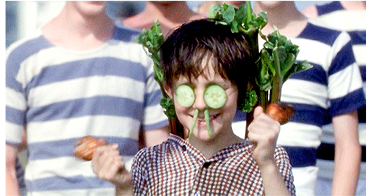 翌日、学校で。ピチェは、目立たぬよう隅にいるスプルートの前に来ると、顔の痣を見て、「どうしたんだい? ケンカかい? 誰と?」と訊く。返事がない。「誰がやったか言えよ。仕返ししてやる」。「ダメだよ」。「なんで? 殴られっ放しで、いいのか? なあ、誰なんだ?」。「父ちゃんさ。頭にくると、ボクをぶつんだ」。「それって、時たま?」。「いつもさ! ウチには、全然 お金がないし、父ちゃんは無職だ」。それを聞いたピチェは、自分のランチをスプルートに渡す。「こんなこと、いけないよ」(1枚目の写真、矢印はサンドイッチ)。「要らないから あげるんだ。僕たち、友達だろ?」。そしてさらに、「大切なことが2つある。パパが言うにはね、1つは、物を分かち合うこと」。ここで、始業の鈴が鳴る。「行こう」。「で、2つ目は?」。「お互いを信頼することさ」(2枚目の写真)。ピチェは、「持ちたい友達ナンバー・ワン」と言える。