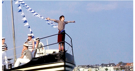 その頃、ピチェは、颯爽とした船に救助されていた。ピチェは、そこでも、ふざけて人気者になる(1枚目の写真)。「君を釣り上げたのは、大正解だ!」と水夫たちは大喜び。その後は、映画『タイタニック』(1997年)の真似。もっとも、映画の舞台は1930年代なので、1997年の映画の真似をピチェがしたわけではない。2002年の映画が1997年の映画をパクっただけ。それでも、結構決まっている(2枚目の写真)。背景にオランダの街並みがあるからだろうか。ピチェが父に抱きついた姿をフェイリンハがバッチリ写真に収め、その日の夕刊の一面を飾る(3枚目の写真)。見出しは、「ピチェ・ベル、無事発見」。最初にパレードをしていた新聞王は、この記事を見て、「何だ、このバカげた紙面は、間抜けなガキを一面で取り上げおって。誰が、読みたがるというんだ」と批判する。