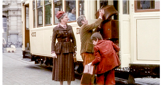 ここから、新たな登場人物が現れる。父の伯母のカト、巨大な鼻の持ち主だ。父と一緒に迎えに行きながら、ピチェは、「パパ、カト伯母さん、どんな人?」と尋ねる(1枚目の写真)。「鉄面皮な女性だ〔Als je een ouwe tang ziet, is zij het〕」〔この中の “ouwe tang” は「鬼ババ」という意味。しかし、“tang” だけでは「ペンチ」のような金具の意味になる。ピチェは “ouwe tang” という言い回しを知らず、“tang” だけ抜き出して誤解するが、「鬼ババ」では誤解の感じが出ないので、「鉄」の入った言葉を捜し「鉄面皮」に辿り着いた。だから、誤訳ではなく意訳〕。「お土産ある?」。「まさか。1セントでもくれたら、大ニュースだ」。伯母は、路面電車の前で待っていた。電車のドアには荷物が山積みになっている。親子2人がかりで荷物を下ろす(2枚目の写真)。「ひどい旅だった。3度も乗り換えて4時間もかかったわ」〔伯母の住んでいるデルフトは、ロッテムダムから10キロちょっとしか離れていない〕。「そりゃ、汽車にしないからですよ」。「お金が かかるわ」。そして、ピチェを見て、「あんた誰?」と訊く。「小さいピチェ」。「あんたが ピチェなの。初めて見るわ」。「ボクも初めてだよ」。「キスして」。他の人の2倍ある鼻と、その先端の大きなイボを見て、ピチェは嫌々キスする(3枚目の写真、矢印はイボ)。「医者に行った方がいいんじゃない?」。「まあ、なぜなの?」。「鼻に、すごいイボがある」。「何て生意気な子なの?」。父:「事実を話せと教えてますから。タクシーを呼びます?」。「いいえ、歩くわ。その方がいいでしょ」〔大量の荷物はピチェ親子に持たせる〕。父は、小声で「居座られると困るな〔Ik hoop dat ze gauw ophoepelt〕」と言う〔この部分の正しい訳は、「すぐいなくなるといいな」だが、後で出てくる会話との関係で、意訳した〕。