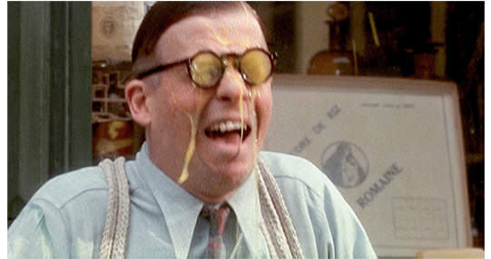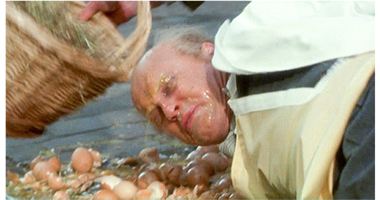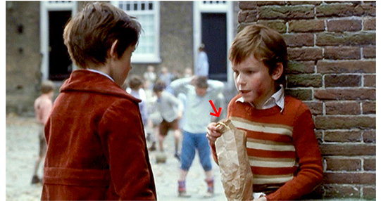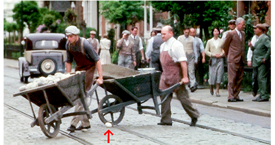 1930年代のロッテルダムのブレー通り(Breestraat)。そこには陽気なピチェ・ベルが靴修理の小さな店を構えていた。子供は小学校の先生をやっている姉のマルタ(20歳以上)と、腕白盛りの少年ピチェ・ベル(父と同名)。ピチェは、いわばガキ大将で、その日も、エンゲルチェとペイニェの3人で、仇のようなフェールマン薬剤店の親子(父の名はオーゼビエス、息子の名はヨゼフ)、特にヨゼフ(マルタと同じ小学校の先生)を狙っている。ちょうど卵売りが、「おいしい卵が、1個3.5セント」と売りに来る。オーゼビエスは「先週より、1セント高い」と文句を言う。卵売りは「たった、1セントですよ」と言うが〔2.5→3.5なので、40%も値上げ〕、オーゼビエスは「1セントは1セントだ。着る物にだって、お金がかかる」と文句。ここで、横に座っていたヨゼフが、「新しい眼鏡を買ったところでね」と、掛けてみせる。離れた所から隠れて見ていたピチェは、「ひどい顔」とひょうきんに言う。卵売りは「少し、小さいのもありますよ」と、卵を顔の前に出して見せる。ピチェはパチンコを取り出すと、「いくぞ、ハゲ頭」〔オーゼビエスの方〕と言い、卵の真ん中を狙って石を放つ(1・2枚目の写真、矢印は卵に当たる直前の石)。石の勢いで卵の中身はヨゼフの目を直撃する(レンズも割れる)(3枚目の写真)。驚いた卵売りが百個以上卵の入ったバスケットを落とし、「クソッタレの、ピチェ・ベルめ!」と怒鳴ったオーゼビエスが近づこうとして、割れた大量の卵に足を滑らせて転倒。顔中、卵まみれになる(4枚目の写真)。映画の冒頭を飾る、楽しいスタートだ。
