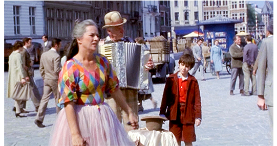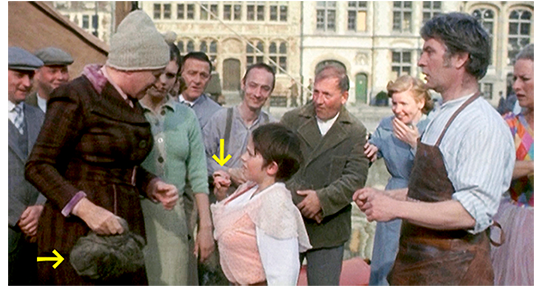 学校の帰り、ピチェは広場で踊ってチップをもらっている2人組〔帽子の中は ほとんど空〕を見て(1枚目の写真)、「ちょっと、待っててね」と言うと家に走って帰る。そして、自分の部屋に行くと、眠っている伯母の禿げた頭を見て、ベッドの上の棚に置いてあるカツラに気付く。そして、もう一つ気付いたのが、コップの中に入れてあった総入れ歯。次のシーン。広場では、ピチェが、カツラを被り、姉の新しいドレスを着、右手に持った総入れ歯をカスタネットにようにカチカチさせて踊っている。周りは黒山のような人だかり(2枚目の写真、黄色の矢印はカツラと総入れ歯、赤の矢印は姉のドレス)。帽子の中にはどんどんお金が入れられる。そこに、頭にニット帽を被った伯母、姉、父の3人が駆けつける。伯母は、「悪ふざけは、もうたくさん! 年寄りを笑い者にするなんて!」と言うと、カツラをむしり取る(3枚目の写真、左の矢印はカツラ、中央の矢印は総入れ歯)。「この恥知らず! 顔も見たくない!」。総入れ歯も奪い返す。それを、フェイリンハが写真に撮る。姉は、「写真なんか撮らないで! 入れ歯もない人を!」と非難し、ピチェには、「これ、私の新しいドレスじゃない! こんなに しちゃって!」と怒る。「伯母さんが やったんだ!」〔伯母は、ピチェをつかんで揺すったが、ドレスを傷めたがどうかは不明〕。父は、「こら! ごまかすな!」と言うと、ピチェの後頭部を叩く。伯母は、「市電まで連れていって。早く帰りたい」と言いながら、姉と去って行く。