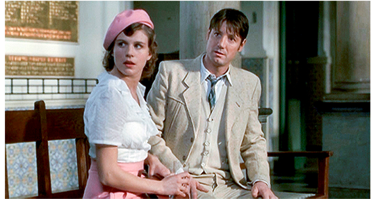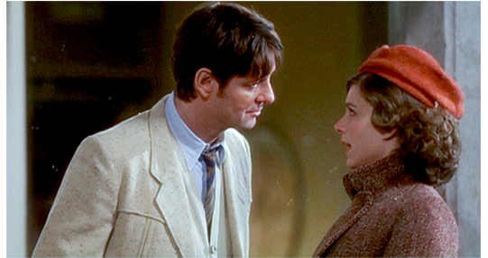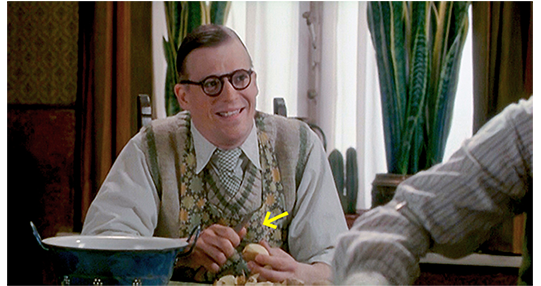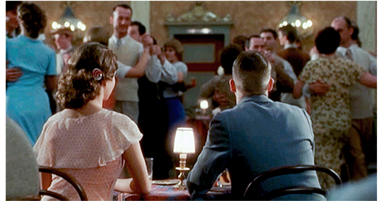 レストランで姉とヨゼフが一緒のテーブルについている。ヨゼフをじっとドレスを見ているので、姉は「何、見てるの?」と訊く。「ドレスに穴が開いてる」。「ああ、これね。新しいドレスなの。気に入った?」。「新しいドレスには、穴なんてない。それに、襟に変なシワがある」(1枚目の写真、矢印はシワ)「それ、バーゲン品なんだろ?」〔嫌な性格〕。「これは、事故のせい」。「そうだろうとも」。「ピチェが仮装に使って、めちゃめちゃに…」。自分の失礼な勘違いは棚に置いて、にっくきピチェを攻撃する。「いつも そうだ! 君は寛容すぎる。誰かが、懲らしめてやらないと」。姉は、あくまで優しい。「そうね。でも、伯母さんから解放してくれて感謝してる」。そして、「母が直したの」と付け加える。ヨゼフは、「僕の方が上手だ」と気持ち悪いことを自慢する〔現在なら男女同権でおかしくはないが、1930年代では異常〕。「あなたが?」。「もちろん。男性が裁縫するなんて信じないだろ? 靴下も自分で直してる。君のお母さんのは手抜き仕事だ」〔実に嫌な性格〕。姉は、その言葉にもムッとせず、「踊らない?」とにこやかに訊く。形勢は逆転。踊れないヨゼフは、「オレンジ・スカッシュが まだ残ってる」と言って誤魔化す(2枚目の写真)。