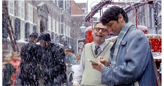 怒ったピチェは、夕闇迫る雪の街を新聞社に直行する。そして、オフィスに入って行くと、「ポール・フェイリンハを捜してる!」と叫ぶ。「私が、ポール・フェイリンハだ」。それを見たピチェは、「びしょぬれ男か、失望したよ」と蔑むように言い(1枚目の写真)、帰ろうとする。フェイリンハは、それを引き止め、自分の部屋に連れて行く。「なぜ、新聞に嘘を?」。「嘘だって? そうは思わない」。「どうかしてるよ、嘘ばかり書いて。どこから嘘を聞いたか、知りたいんだ」(2枚目の写真)。「情報源がある」。「『じょうほう源』って? 水源みたいなもの?」。「ネタを教えてくれる人さ。信頼できるんだ」。「悪意があったら? 誰なのさ?」。「教えられない。裏切れないんだ」。ピチェは、「あんた、いろいろ書いてるけど、一度でもボクに尋ねた?」と捨て台詞を残し、部屋を出て行く。この言葉は、フェイリンハにグサッと刺さったようだ。だから、「ピチェ、待って!」と呼び戻そうとする。「裏切者とは話さない」。「私は裏切者じゃない。情報源を裏切れないだけだ」。「違うね。真実を裏切ってるんだ〔Je verraadt de waarheid〕。あんたは記者失格だ。『黒い手』の取材だって、あんたには無理だ」。編集長は思わず咳払い。一方、姉は、新聞社の社長宅を訪れる。「私はマルタ・ベル。『最新ニュース』の社長に話があります」。その時、階段を降りて来たフェイリンハが姉に気付いて出てくる。「あなたも、訪問中とは知らなかったわ」。「訪問中じゃない。住んでるんだ」。「あなたが、社長さん?」。「そうだよ。さあ、中へ」。「ダメ、入れないわ」。「でも、私に話があったんだろ?」。「あなたじゃなく、社長さんにね」。「何が、言いたかったの?」。「悪質なポール・フェイリンハの解雇よ」(3枚目の写真)。姉も弟も、言いたいことはきっちり言っている。