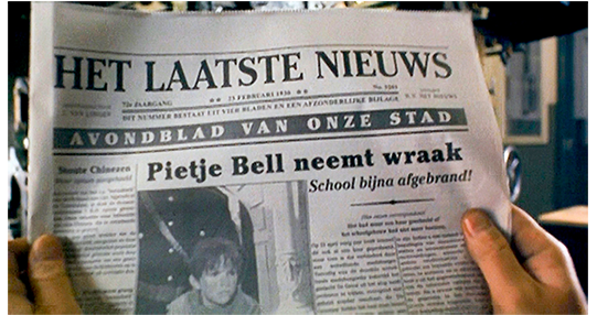一方、ロッテルダムにある もう1つの新聞社では、アメリカで修業していたポール・フェイリンハが、父親の急死で帰国し、社長になったばかり。編集長との会話。ポール:「今日の夕刊は、どうなってる?」。編集長:「無難な一面記事があって、毎度の国際ニュースに、スポーツと犯罪、最後は『百万長者のパレードを、邪魔した子供』、写真付きです」。「見せて」(1枚目の写真)。この青年社長は、思い切った提言をする。「これを、第一面に使おう」。「ご冗談でしょ?」。「いいや。この子の名前は?」。「ピチェ・ベルです」。そして、輪転機が廻り、刷り上った紙面の第一面は、大見出しで、「ピチェ・ベル、新聞百万長者のパレードを混乱させる」。因みに、新聞の名称は「HET LAATSTE NIEUWS(最新ニュース)」、その下の白抜きには「わが街の夕刊紙」と書いてある(2枚目の写真)。