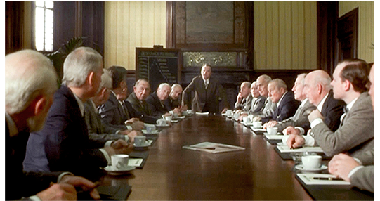 その日の夕刊の一面は、「ピチェ・ベル、仕返しする/学校全焼寸前」 というひどいものだった(1枚目の写真)。その先、毎日の一面の記事が紹介される。「ピチェ・ベル、非常ブレーキを引く/鉄道が何時間も混乱」「ピチェ・ベル、木の上の猫を救う/大の動物愛好家」。ここで、編集長が、フェイリンハ社長に、「くずネタ作戦、大成功ですね」という一コマが挿入され、さらに記事は続く。「ピチェ・ベル、馬を逃がす/市場は大騒動」「ピチェ・ベル、竹馬で街を歩く/道化師、出現」「ピチェ・ベル、鮫の真似/背びれで浜辺がパニック」〔くずネタはいいのだが、①非常ブレーキを引くためにはピチェが汽車に乗っていなくてはならないが、そんなことはあり得ない、②冬なのに海岸に行くハズがないなど、ずさん過ぎる〕。一方、新聞王のオフィスでは、社長が、「売上げが落ちとる。あの くず新聞が部数を伸ばしとるというのに!」と、重役会で怒りを爆発させている(2枚目の写真)。重役の一人が、「我々も、あの少年を載せたら? ご存じでしょう、一面に載ってる子ですよ」と提案する。社長は、「断固、拒否する。一言も載せんぞ、ピチェ何とかなんか…」と発言し、重役全員が「ピチェ・ベルですよ」と言う。彼ら全員も「くず新聞」を読んでいることが分かる。さらに怒った社長は、「これから、一面は『不況』でいく」と宣言する。その後に並ぶ紙面は、「多くの工場、閉鎖される」「失業者、15万人を超える」「20万人が、デモ行進」「失業者、25万人に」。これでは、ますます販売部数が減少したかも。