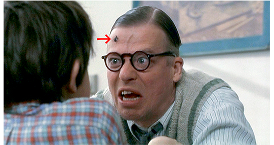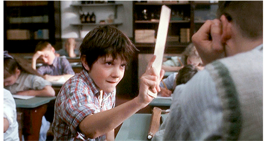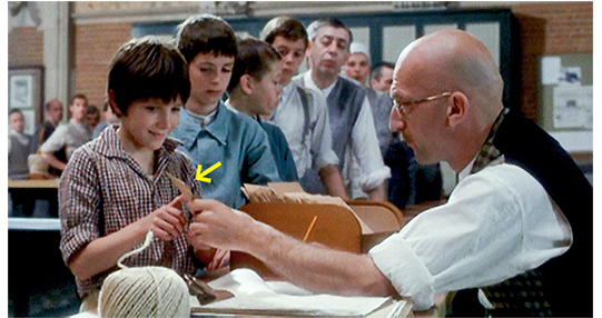 それでも、ピチェの悪戯は健在だ。授業中、生徒にテストをさせ、ヨゼフは教壇でイビキをかいている。ピチェの邪魔をしていた大きなハエがヨゼフの額にとまったのを見たピチェは、教壇まで行くと、置いてあった体罰用の板を取り上げ(1枚目の写真)、ハエを叩き潰す。それで目が覚めたヨゼフは、「もう、我慢ならん! 新聞に書いてあることは正しい! お前は怪物だ!」と怒鳴ると(2枚目の写真、矢印は潰れたハエ→ヨゼフは気付かない)、板を取り上げ、ピチェの手の平が腫れ上がるまで叩き続ける(3枚目の写真、矢印は体罰用の板)。