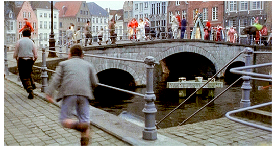 ピチェを心配して追って来た姉は、「真っ直ぐ家に帰って、誘惑には目をつむってるのよ」と命じるが(1枚目の写真)、話をよく聞いていなかったピチェは、「目をつむって」「真っ直ぐ」と言われたと思い、文字通り目を閉じ、バランスのため両腕を前に出し、真っ直ぐに歩き出す。途中に立っていた街路灯にぶつかってしまうが(2枚目の写真)、命令をそのまま継続、最後は運河に真っ直ぐ歩いて行ってドボン(3枚目の写真)。