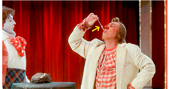 ピチェは父と一緒に観客席で、切符を取られたスプルートはテントの下から潜り込んで、サーカスを見ている。ピチェが気に入ったのは、道化のマジック・ショー。1つ目は、台の上に置いた金の腕時計を大きなハンマーで叩くと(1枚目の写真)、新品が口の中から出てくる(2枚目の写真)、というもの。2つ目は、シルクハットの中に卵や小麦粉などを入れて下からロクソクで炙ると(3枚目の写真)、帽子の中からケーキが出てくる(4枚目の写真)、というもの。これを見たピチェは、あることを思いつく。