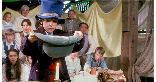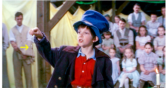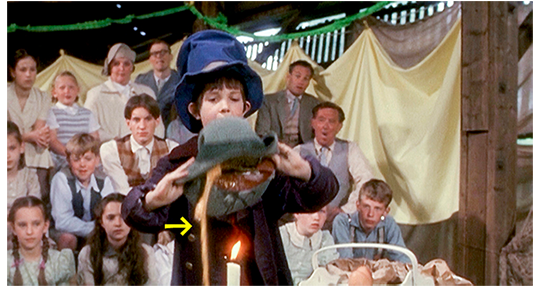 次のシーンでは、風車の横に、「STAADS ZIRKUS/Pietje Bell」という横断幕が掲げられている〔“Staads” は該当言語なし、“Zirkusは” ドイツ語でサーカス(オランダ語は英語と同じCircus)→なぜ?〕。中に入ると、女の子が掲げたボードには、「穴の開いた靴はベルまでどうぞ」と書かれている。ミニ・レスリングや重量挙げのショーもあるが、呼び物はピチェのマジック・ショー。ピチェが、「上等の金の腕時計です」と言って、内緒で持ち出した姉の大事な時計を見せる(1枚目の写真、矢印)。「これを石の上に置いて、ハンマーで…」(2枚目の写真、黄色の矢印は腕時計、赤の矢印はハンマー)と言うと、本当に時計を叩き壊してしまう。「でも、心配は要りません。魔法で、口から腕時計が出てきます」。そして、「ホーカス、ポーカス、プラータス、パス」と唱える。ピチェはこの言葉が魔法の言葉で、だから、サーカスではうまく行ったと思い込んでいる。だから、「さて、これが腕時計です!」と言って口の中に指を突っ込むが何も出て来ない。ピチェは、めげずに2つ目に挑戦する。「新しい帽子が必要です。お持ちの方は?」。子連れの紳士が、「何も、起こらないだろうね? 新品だ」と言って帽子を渡す。ピチェは、「ケーキを焼きます」と言うと、「卵2個と… 小麦粉 少々… それに、砂糖と… 塩も…」と順番に帽子の中に入れていく。最後にかきまぜて、ロウソクの火にかざす(3枚目の写真)。忠実にサーカスの真似をして、魔法の言葉を唱え、「さあ、ケーキです」と言って帽子をひっくり返すと、当然、材料がそのまま流れ落ちる(4枚目の写真、矢印)。それでもめげずに、「さて、いよいよ、クライマックスです!」と言って、ステッキを振ると、ステッキが当たってロウソクが倒れ、置いてあったロケット花火に点火する。