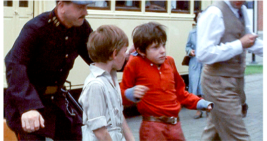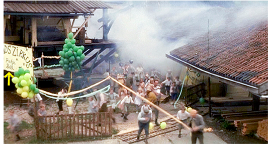 結果は悲惨だった。ロケット花火は製材所の天井に何度も跳ね返り、最後はジュート(黄麻)の網に引っかかって止まる。そこから火が燃え拡がり、観客が逃げ出す騒ぎに(1枚目の写真、矢印は「変な横断幕」)。お金を稼ぐどころか、元手の回収もできず、製材所に与えた損害は賠償のしようがない。スプルートが「家に帰るの?」と尋ねると、ピチェの返事は「まさか。警官が、お待ちかねさ。家出するしかない」。「どこ行くの?」。「アメリカさ。百万長者になる」。「アメリカ? 海の向こうだよ」。「船が いっぱいいるだろ…」(2枚目の写真)。ピチェは、運河の船でアメリカに行く気だ。逆に言えば、その程度の認識しかない。一方、ピチェの父の店には、マジック・ショーで帽子を貸した男性が子供2人と一緒に損害請求に訪れている。父は、「これで、新しい帽子を」と言って、現金入れに残っていた札を全部渡す。「悪いね」。そこに、姉がやってきて、「パパ、腕時計が どこにもないの」と心配そうに言う。それを聞いた男性は、「金の腕時計なら、石の上で粉々ですよ」と教える(3枚目の写真)。姉:「何の話ですか?」。男性の小さな娘:「あれ、最高に笑えたわ」。そこに入って来たオーゼビエスが、「言わせてもらえば、あれは、前代未聞だった! あんたの息子は、製材所に火を点けたんだ。町中が、その話でもちきりさ」と事件をバラす。用の済んだ親子は店を出て行き、代わりに警官が入ってくる。「大変だ。誰か怪我人は?」。「出なかった。だが、究極の悪戯っ子だな! ヨゼフが、逐一見とった。将来は犯罪者だな」。警官が、「本官は、ピチェ・ベルを捜しておる」と割り込む。
