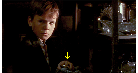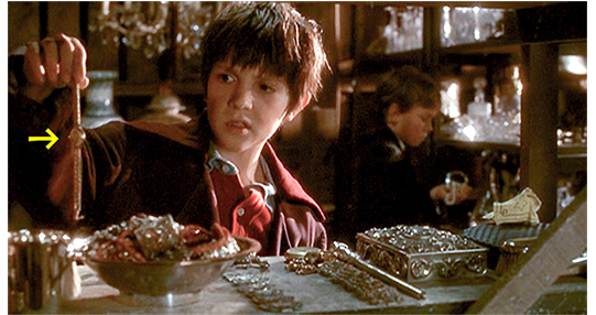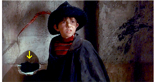次のシーンでは、ピチェとスプルートは、古い小屋の中で目隠しをされ柱に縛られている(1枚目の写真)。ピチェ:「もう 最悪」。スプルート:「何も、見えないよ」。「知ってる魔法は1つだけ」。「効かなかったじゃない」。それでも、ピチェは魔法の言葉を唱えると、体をくねらせてロープから脱出する。魔法が効いたというよりは、2人を同じ縄で柱に縛り付けたため、緩みがあっただけ。それでも、前向きなところがピチェらしい。目隠しを取ると、周りの棚には「お宝」が一杯置いてある。スプルート:「きれいなものが、こんなにいっぱい!」。ピチェは、「ここは強盗の巣〔rovershol〕だ。略奪品の隠し場所だ」と的確に判断する。置いてあった中に、壊してしまった姉の金時計にそっくりなものを発見し、手に持ってみる(2枚目の写真、矢印)。「マルタ、違いに気づくかな?」と気をそそられるが、悪戯っ子でも泥棒ではないピチェは、「やめよう」と時計を元に戻す。そして、隣にあったサーカスの切符を見て、「奴ら、サーカスにも行ったんだ」と言って、切符を丸めて投げ捨てる。一方のスプルートは、食料を常時盗んでいたくらいの常習犯なので、置いてあった宝石や貴金属をポケットに布にくるんでポケットに入れる(3枚目の写真、矢印)。そして、ピチェが捨てたキップを拡げてみると、父にあげた切符だと分かる〔左上に、“Voor Papa(パパへ)”と書いてある〕。スプルートは、父が窃盗団の一味だと知って愕然とする。