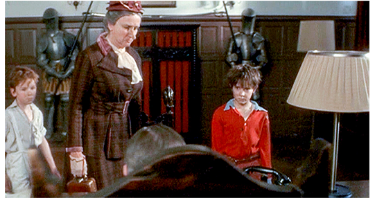 伯母がピチェのベッドに横になると、ピチェは母の所に降りてくる。そこに姉が新しいドレスを持って入ってくる。そして、「スカートのひだを、見てちょうだい」と自慢する。「とても素敵よ、マルタ」。しばらくして、ピチェは自分の部屋のドアをそっと開けて中を覗き、伯母が眠っていることを確かめる(1枚目の写真)。そして、ベッドに近づくと、輪にした糸を大きなイボにかける(2枚目の写真、矢印は輪の中に入ったイボ)。そして、切断しようと一気に糸を引く。しかし、イボはとれず、糸が締まっただけ。伯母は痛さで目が覚める。「何てことするの?!」。鏡を見て、「この糸、一体 何なの? こんなことするなんて! 何て悪い子なの!」。「ボク、悪い子じゃない」。「勝手なこと ばかり! あっち行って!」。「でも、伯母さん、それ取り除かないと」。「伯母さんなんて呼ばないの! おやめ! お前のお父さんの伯母なのよ」。「伯母さんが分かってるなら、それでいいじゃない」(3枚目の写真)。